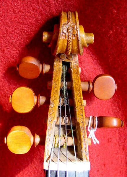 This instrument has nothing in common with the German-Austria five-string violin (Nr. 37). We are dealing with a completely new invention here, which arose in France around 1710 and fulfilled completely different tasks. The tuning is like a violin below (g-d-a) and like a viol above (a-d-g), and held between the legs, this instrument allows an noble person to perform the repertoire of the violin with ease. Mme Henriette de France, daughter of Louis XV, was proficient on this and also the pardessus de viole.
